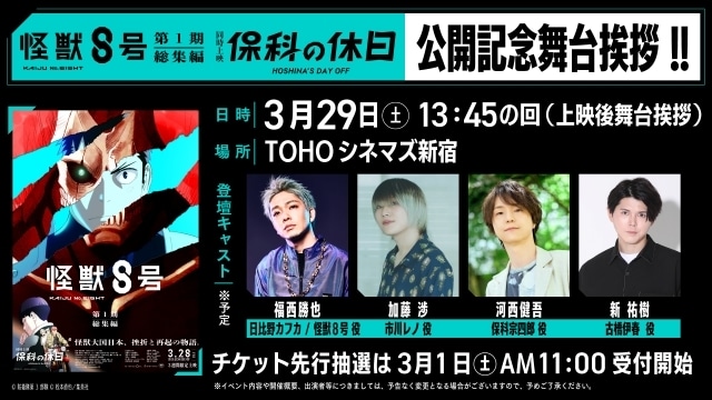 3月29日(土)に、日比野カフカ/怪獣8号役・福西勝也さん、市川レノ役・加藤渉さん、保科宗四郎役・河西健吾さん、古橋伊春役・新祐樹さんが登壇する、公開記念舞台挨拶の開催が決定しました!