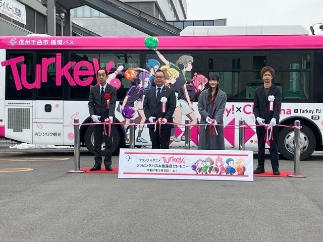 さらに本日は、本ラッピングバスの完成を記念して、オリジナルアニメ、「Turkey!」ラッピングバス お披露目セレモニーを開催した。千曲市の小川修一市長、本作品の主人公・音無麻衣役を務める声優の菱川花菜さんが登壇し、セレモニーを盛り上げ、テープカットを行いました。