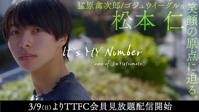 「猛原禽次郎/ゴジュウイーグル」役の松本仁さんにフォーカスを当てた、『It's MY Number case of Jin Matsumoto』を3月9日(日)午前10時(本リリースの解禁時刻)よりTTFC会員見放題配信開始します。