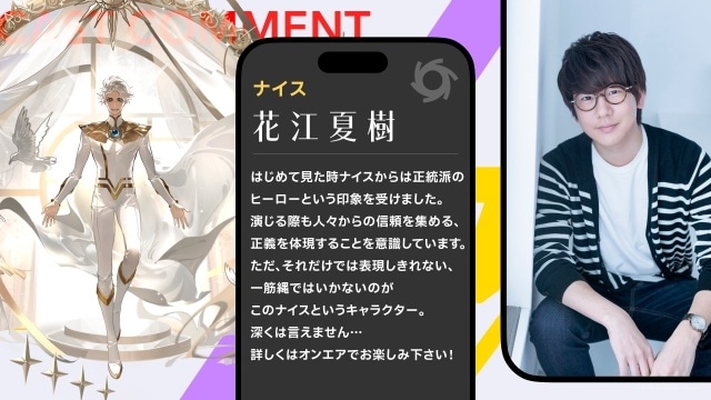 ナイスを演じた花江は「正統派のヒーローという印象を受けました。演じる際も人々からの信頼を集める、正義を体現することを意識しています」としつつも「ただ、それだけでは表現しきれない、一筋縄ではいかないのがこのナイスというキャラクター」とコメント。
