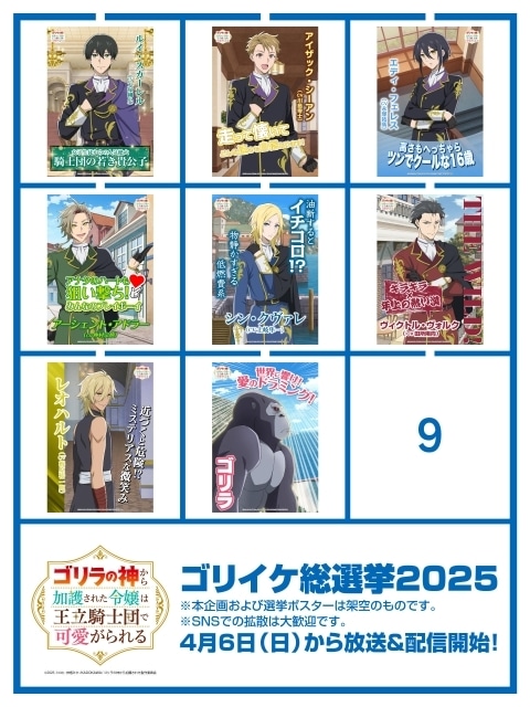 2025年4月6日(日)より放送開始となるTVアニメ『ゴリラの神から加護された令嬢は王立騎士団で可愛がられる』では、放送開始を記念して、4月1日にエイプリルフール企画「ゴリイケ選挙2025」の実施が決定!