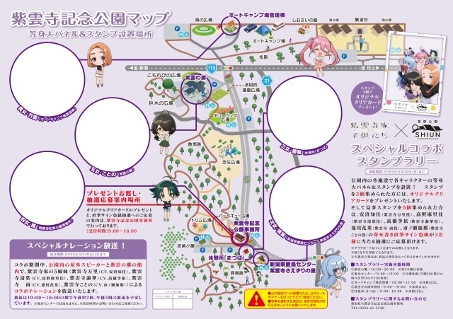 コラボ期間中、公園内の屋外スピーカーと紫雲の郷の館内で、紫雲寺家の5姉妹〈紫雲寺万里(CV.安済知佳)、紫雲寺清葉(CV.高野麻里佳)、紫雲寺謳華(CV.高橋李依)、紫雲寺 南(CV.菱川花菜)、紫雲寺ことの(CV.市ノ瀬加那)〉によるコラボナレーションを放送いたします。