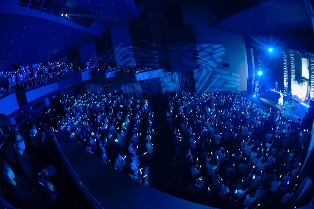 音が一瞬止んだと同時にセンターの水色の短冊に前島のシルエットが浮かぶ。その瞬間一気に青く澄んだ世界に引き込まれ、デビューアルバムの表題曲『Determination』(M1)で1stライブがスタートした。