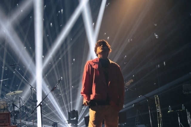 会場全体を光の束が射抜く幻想的な風景の中の切なげな歌声が胸を刺し、歌で綴られる彼の内省的なドラマは、続く「流転」でさらに深みを増す。