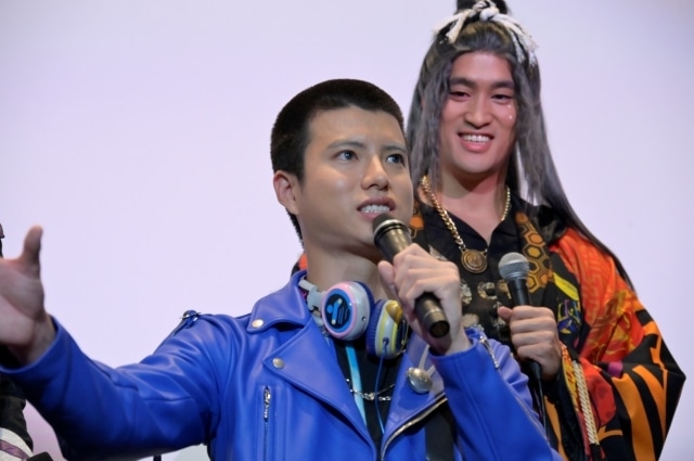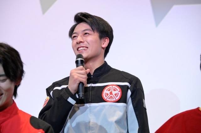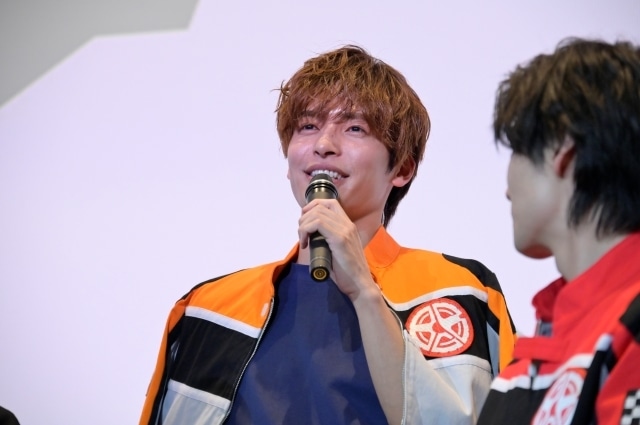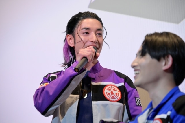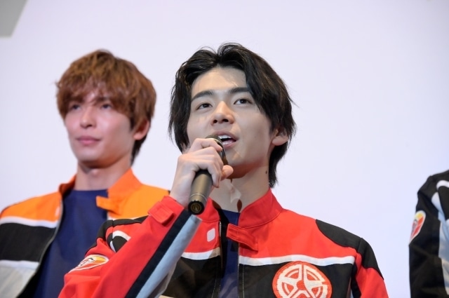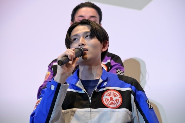 本作では、戦隊同士の新たな組み合わせが見どころの一つで、大也とギラはヤルカーとともにシュゴッタム&バグナラクへ。上映前ということでネタバレしない程度でというMCの言葉に「大也が……、これ言っていいの?」とどこまで言えば不安がっていた酒井だったが、「大也とギラがシュゴッタムに来て、どうなるのかをぜひ注目していただきいですし、2人が車に乗るところも見どころの一つじゃないかなと思います」とコメントし、「待ち時間はどうしていた?」という質問に、井内は「2人での待ち時間が多かったので、『今はどんな感じの撮影している?』とか2人で行ったロケ場所の話とかもしました」、酒井が「車にクーラーが付くんですけど、夏場だったので、めっちゃ涼しかったです」と振り返り、平和な2人のやり取りに佳久は「波長が合っている」とフォローしていました。