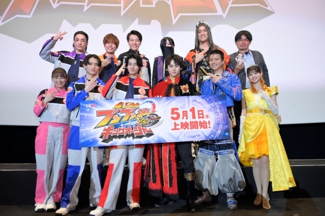 Vシネクスト「爆上戦隊ブンブンジャーVSキングオージャー」完成披露舞台挨拶が4月16日、東京・新宿バルト9で行われ、爆上戦隊ブンブンジャーより井内悠陽、葉山侑樹、鈴木美羽、齋藤璃佑、相馬 理、宮澤 佑。王様戦隊キングオージャーより酒井大成、渡辺碧斗、村上愛花、平川結月、佳久 創が役衣装で、また加藤弘之監督はこの日欠席となった池田匡志演じるジェラミー・ブラシエリのぬいぐるみを持ってそれぞれ登壇しました。