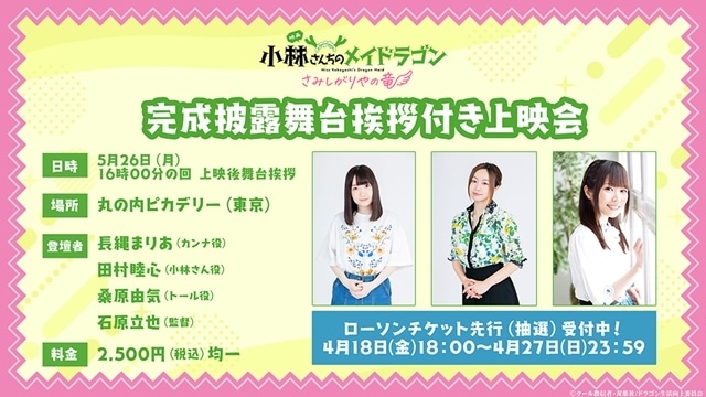 場所は、丸の内ピカデリーで、カンナ役の長縄まりあさん、小林さん役の田村睦心さん、トール役の桑原由気さん、監督の石原立也氏が登壇。