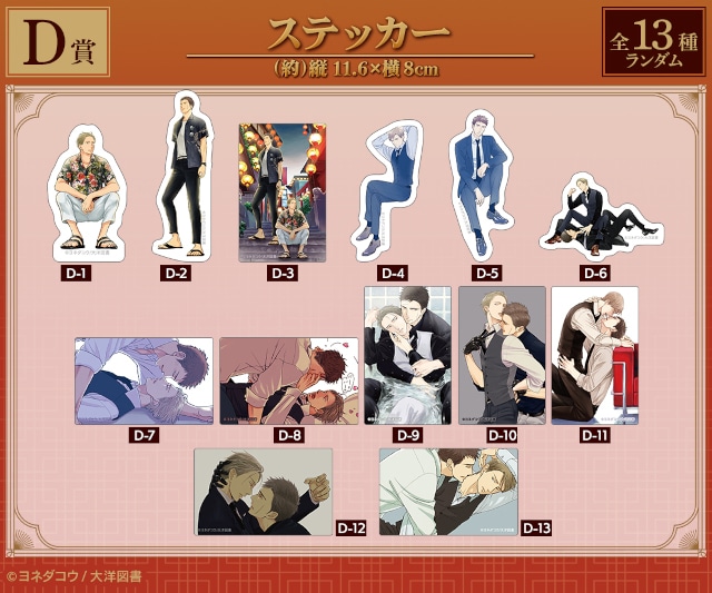 折り畳み傘、アクリルブロック、アクリルコースター、ステッカー、ホログラム缶バッジといった豪華景品の中からハズレなしで必ずいずれかが当たります。中には好評を博した「矢代&百目鬼 旅行ver.」のイラストを使用した新規アイテムも!!