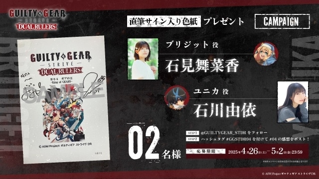 TVアニメ『GUILTY GEAR STRIVE: DUAL RULERS』#04放送を記念して、ユニカ役 石川由依さんと、ブリジット役 石見舞菜香さんのサイン入り#04台本を、2名様にプレゼントいたします。