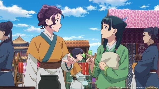 | キャスト | 猫猫(マオマオ):悠木碧 壬氏:大塚剛央 高順:小西克幸 玉葉妃:種﨑敦美 梨花妃:石川由依 里樹妃:木野日菜 阿多妃:甲斐田裕子 梅梅:潘めぐみ 白鈴:小清水亜美 女華:七海ひろき やり手婆:斉藤貴美子 羅門:家中宏 李白:赤羽根健治 小蘭:久野美咲 やぶ医者:かぬか光明 馬閃:橘龍丸 風明:日髙のり子 羅漢:桐本拓哉 翠苓:名塚佳織 陸孫:内山昂輝 鳳仙:桑島法子 皇太后:能登麻美子 子昌:チョー ナレーション:島本須美 |