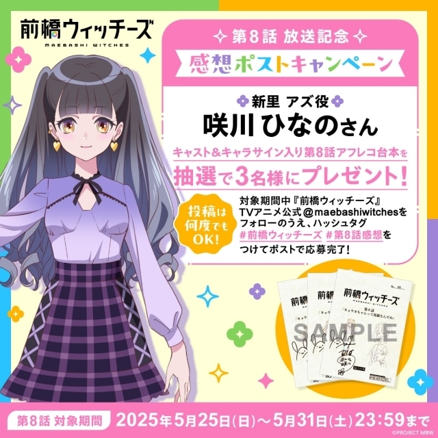 オリジナルアニメ『前橋ウィッチーズ』の放送を記念して、新里 アズ役 咲川ひなのさんのキャスト&キャラサイン入り第8話台本を、3名様にプレゼントいたします。