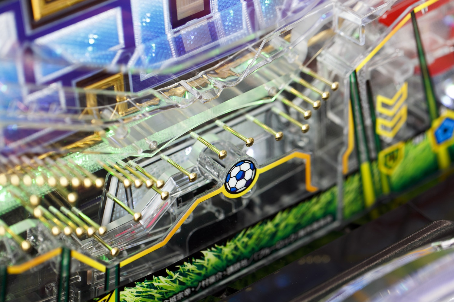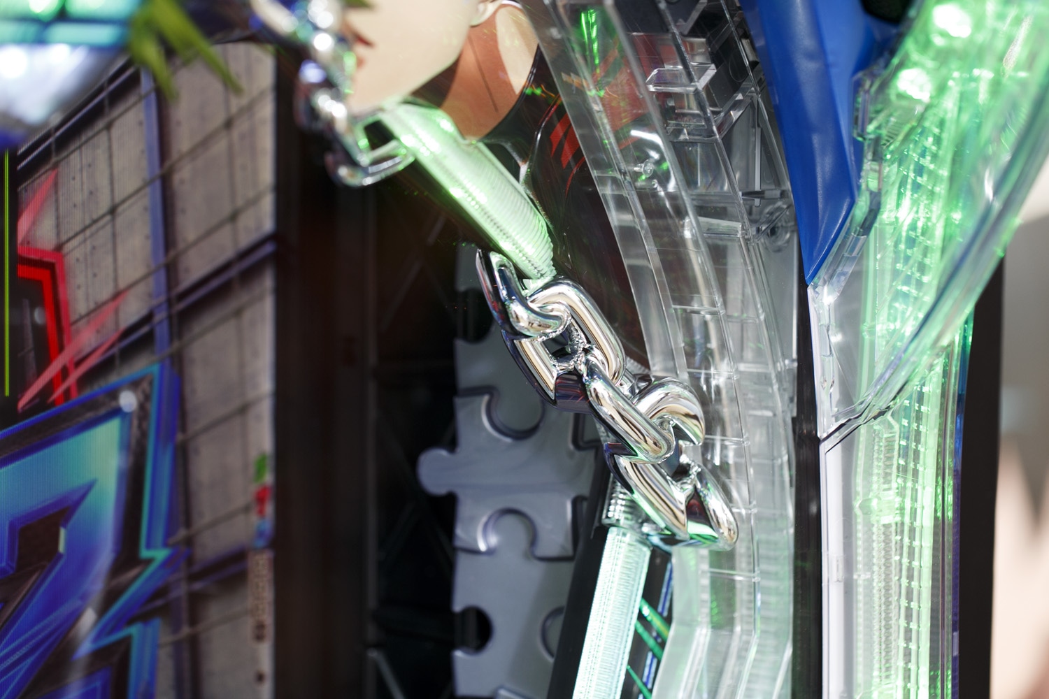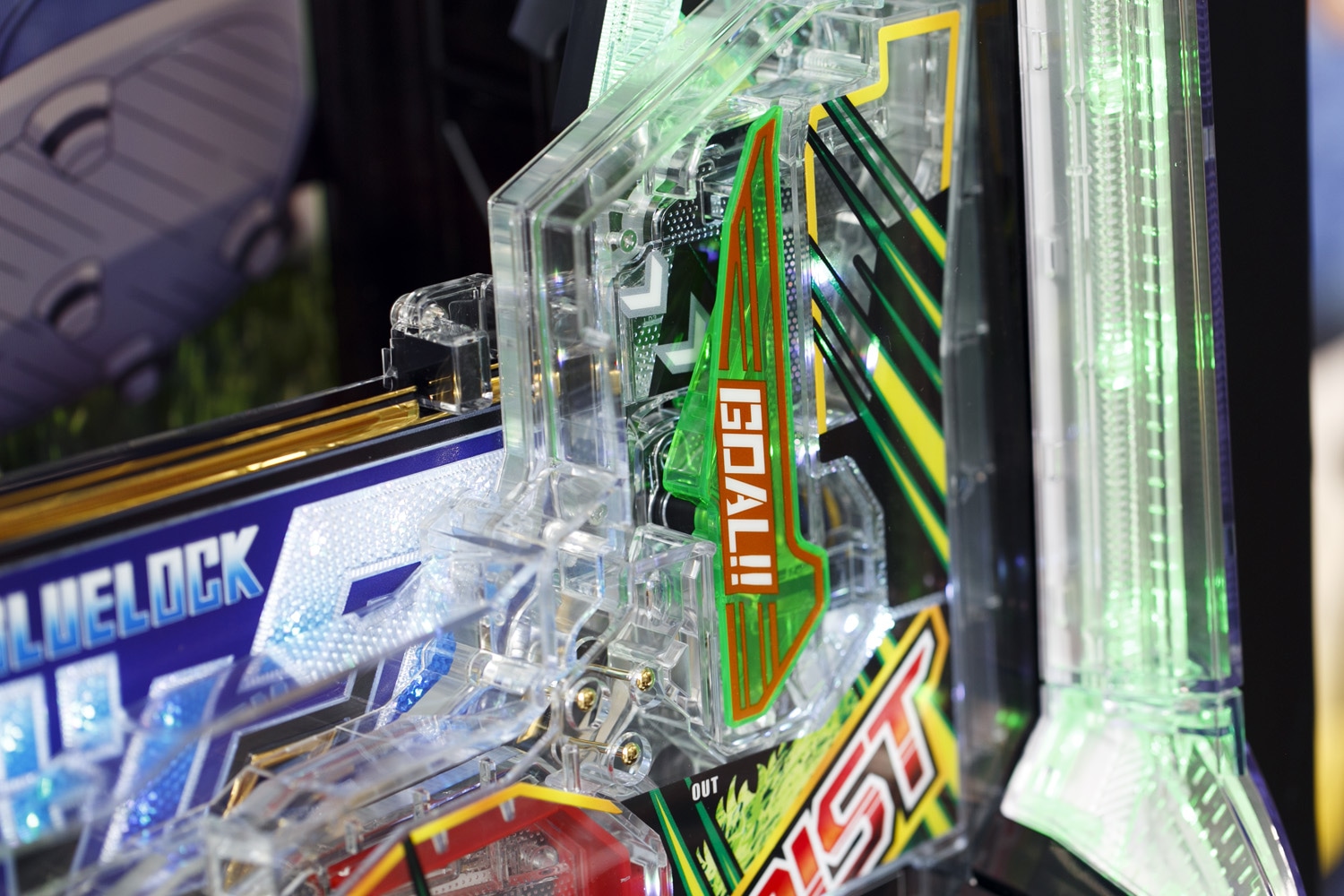 そんな話に期待が煽られつつも、さらに実機に近づいて内部をじっくり見てみると、「KICK OFF!」の文字と共に対峙する潔と凛の姿がキラキラと光っていたり、本作の演出でもたびたび出てくる鎖が立体になっていたり、下部のところがサッカーコートになっていたり。その至るところからこだわりを感じることができました。