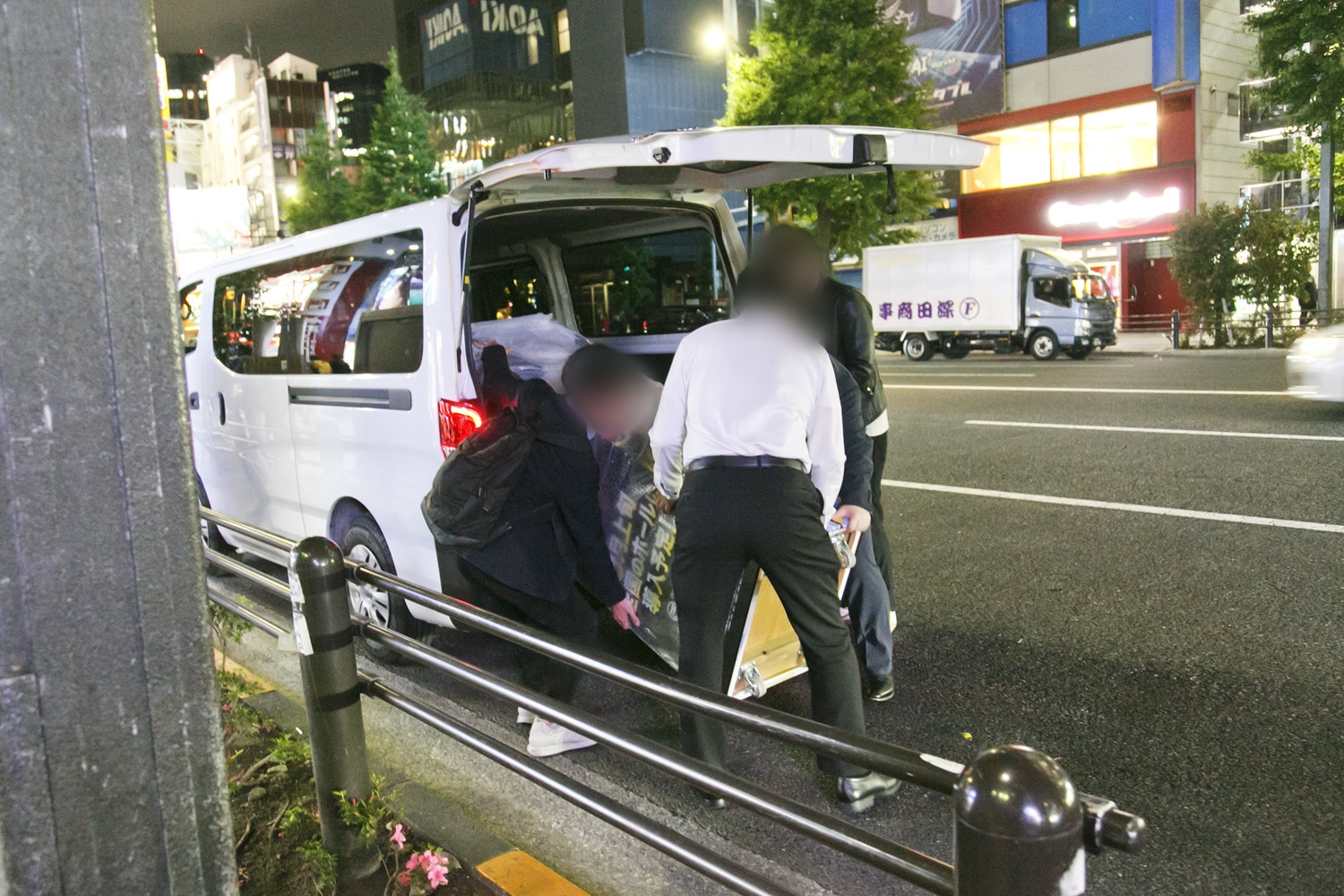 アニメイト秋葉原店の閉店後の21時ごろ。大きなワンボックスカーの中からパチンコ機『eフィーバーブルーロック』が店内へと運ばれていく様子をキャッチしました。