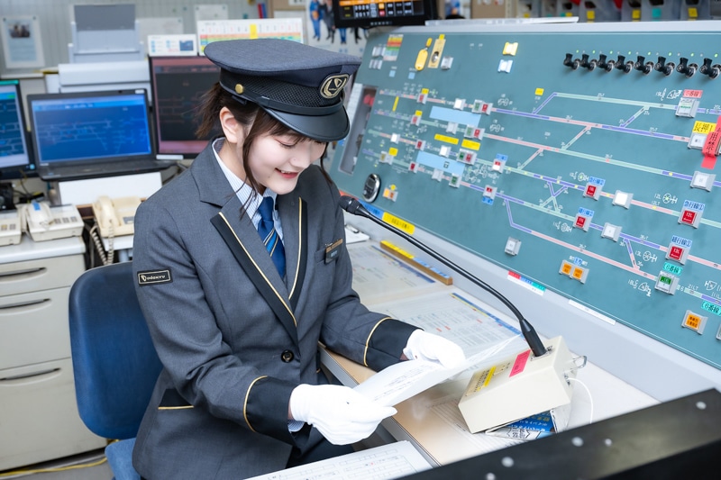 これには2人も喜んだ様子で、そんな駅長さんからレクチャーを受けつつ、まずは1日の運行の無事を祈願したり、業務に関する連絡事項の伝達を行う朝礼から実施することに。安済さんと菱川さんは駅長さんのお手本を参考にしつつ、集まった職員さんたちとお仕事に入る前のスピーチを行いました。