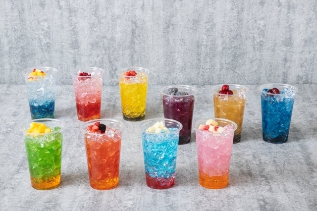 ・最奥左から:オールマイトのブルーハワイソーダ/エンデヴァーのトロピカルソーダ/ホークスのレモンスカッシュ