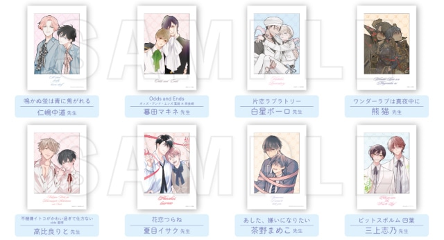 参加タイトルは、暮田マキネ先生『Odds and Ends オッズ・アンド・エンズ 薬袋×奈良崎』、仁嶋中道先生『鳴かぬ蛍は青に焦がれる』、白星ボーロ先生『片恋ラブラトリー』、夏目イサク先生『花恋つらね』、高比良りと先生『不機嫌イトコがかわい過ぎて仕方ない side直樹』、熊猫先生『ワンダーラブは真夜中に』、茶野まめこ先生『あした、嫌いになりたい』、三上志乃先生『ピットスポルム』です。