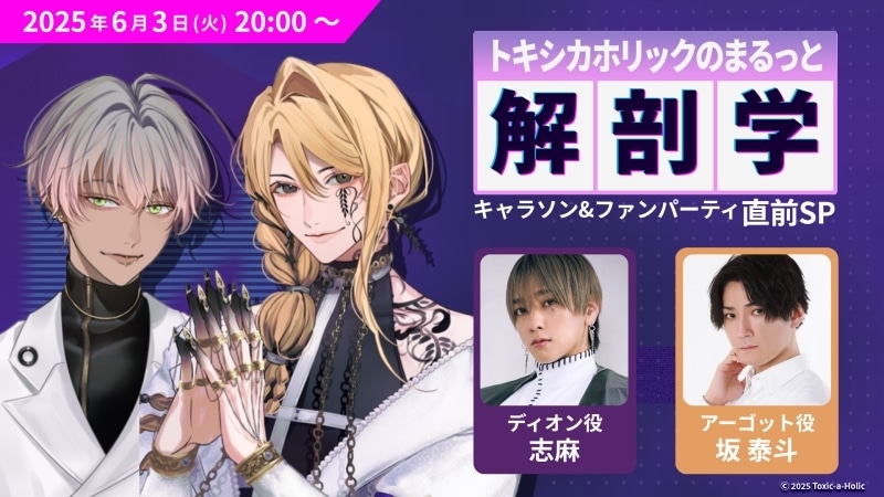 6月3日(火)の生配信では、『Toxic-a-Holic』の最新情報をお伝えします。また、キャラクターソング第4弾としてアーゴット(CV:坂泰斗)の楽曲を振り返りつつ、第5弾となるディオン(CV:志麻)の楽曲に関する情報もお届けします。