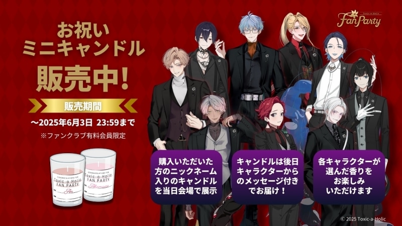 また本イベントの開催を祝う「お祝いミニキャンドル」をファンクラブ有料会員限定で2025年6月3日(火)23:59まで販売しております。購入者のニックネーム入りミニキャンドルを会場で展示し、後日お届けいたします。各キャラクターが選んだ香りをお楽しみいただけるグッズです。
