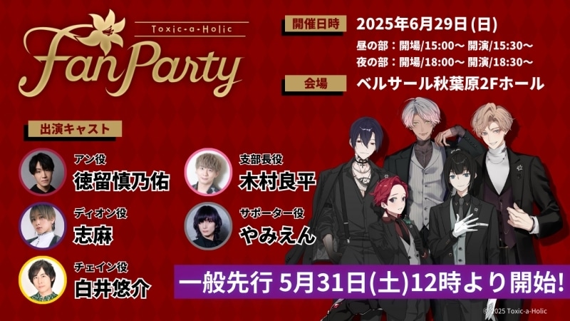 『Toxic-a-Holic』初のリアルイベント「『Toxic-a-Holic』Fan Party」の一般先行を2025年5月31日(土)より開始いたします。本イベントでは、『Toxic-a-Holic』出演声優による朗読劇やトーク、バラエティ企画が満載のステージです。さらに、会場では最新情報の発表も予定しています。