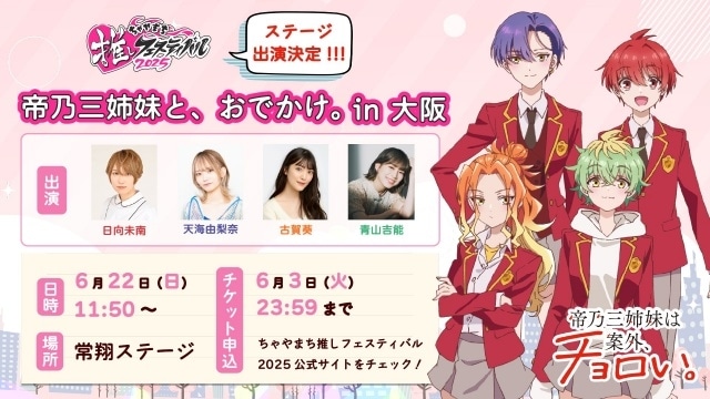 6月21日(土)、22日(日)に開催される「ちゃやまち推しフェスティバル2025」にて「帝乃三姉妹は案外、チョロい。」のステージイベントを実施!イベント公式サイトにてチケット申込受付中ですので、ぜひご応募ください!