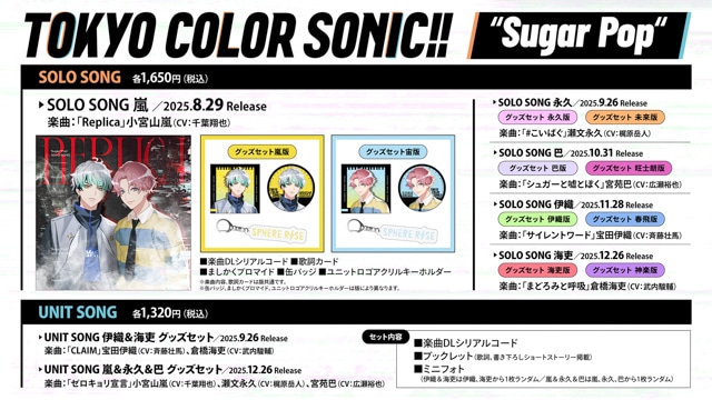”Sugar Pop”グッズセット各種は5月30日(金)の12時よりアニメイト全店舗・アニメイト通販にて予約開始! 第1弾「東京カラーソニック!! "Sugar Pop" SOLO SONG 嵐 グッズセット嵐版/宙版」は8月29日(金)発売予定です。