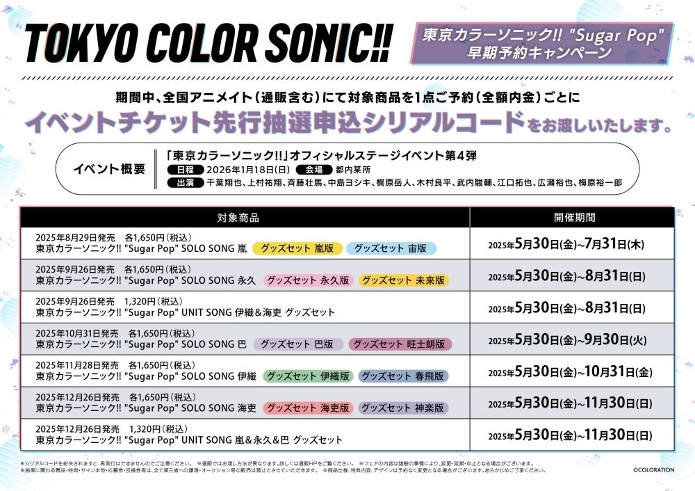 さらに、アニメイト早期予約特典には2026年1月18日(日)開催となる「東京カラーソニック!! Special Live -Sugar Pop-(ソニライ4th)」の「イベントチケット先行抽選申込シリアルコード」をお渡しします。各グッズで早期予約特典の締切日が異なりますので、詳細は各グッズ情報をご確認ください。