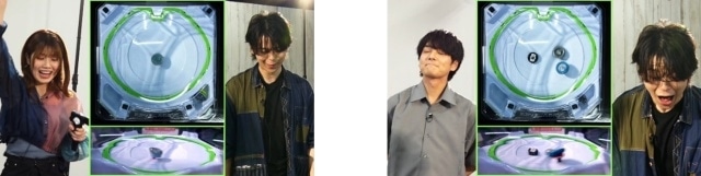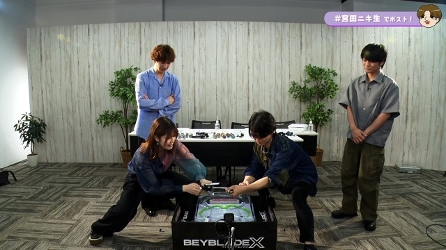 すると、⼟岐が宮田に「防御型の回し方があって。回すときに思いっきり傾けて」とアドバイス。榎⽊が攻撃型のベイブレード、宮田は防御型のベイブレードを選んでおり、そうしたベイブレードのタイプによって戦い方が変わっているということです。