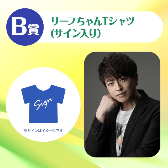 緑川光さんと1対1でのオンラインお茶会をはじめ、リーフちゃんTシャツ(サイン入り)、シチュエーションボイスといった豪華景品をラインナップ。