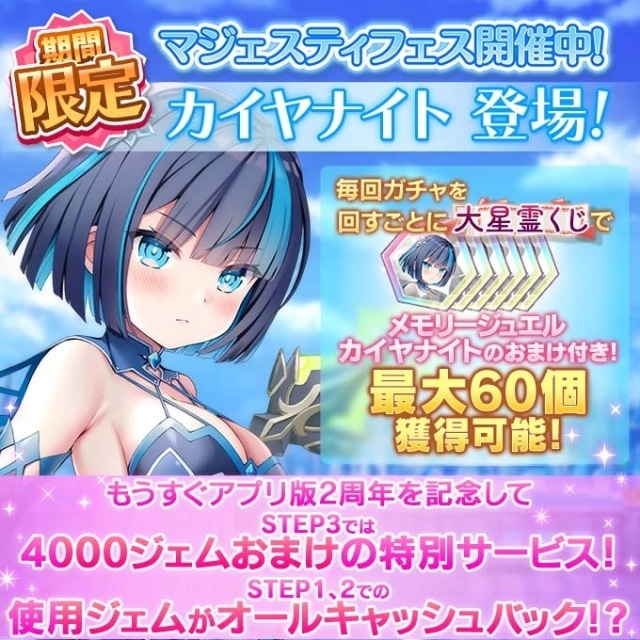 さらに今回のガチャでは、一定回数回すとカイヤナイトの排出確率が1→2%まで増加! もうすぐアプリ版2周年を記念してSTEP3では4000ジェムおまけの特別サービス!STEP1、2での使用ジェムがオールキャッシュバック!?