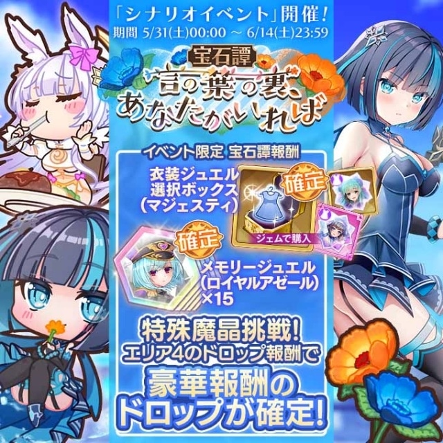 2025年5月31日(土)00:00 ~ 2025年6月14日(土)23:59までの間、『宝石譚 言の葉の裏、あなたがいれば』イベントを開催いたします。本イベントでは新宝石姫カイヤナイトが登場。宝石姫たちの掛け合いをお楽しみください。