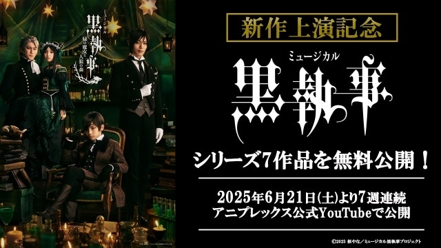 また、新作公演の上演を記念して、アニプレックス公式YouTube にて、6月21日(土)よりミュージカル「黒執事」シリーズ7作が順次無料公開決定しています。