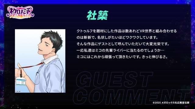 また、第1話にゲスト出演する、にじさんじ所属のバーチャルライバー「ジョー・力一」さん、「社築」さんよりコメントが到着しています。