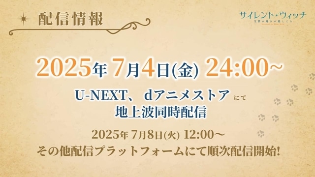 2020年より『小説家になろう』で連載され、シリーズ累計1.3億PVを誇る人気ハイファンタジー『サイレント・ウィッチ 沈黙の魔女の隠しごと』KADOKAWAより刊行の書籍もシリーズ累計100万部を超えています。同作のTVアニメが7月4日(金)24時00分より各局にて放送開始予定となっています。