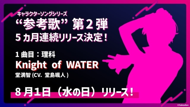 さらに、キャラクターソングシリーズ“参考歌”の第2弾が制作決定! 1曲目の堂満智による『Knight of WATER』は、8月1日(金)リリースです。