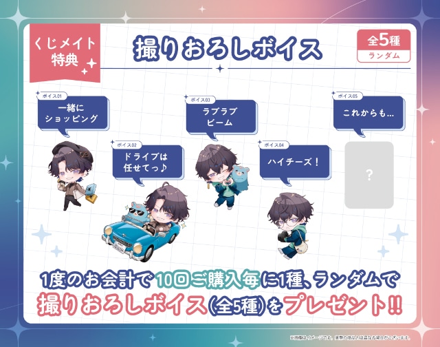 また、本くじを1度のお会計で10回分ご購入ごとに特典「撮りおろしボイス(全5種)」がランダムで1種もらえるので、ぜひチェックしてみてください♪
