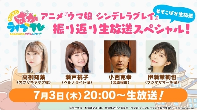 「そこそこぱかライブ TV Vol.46 アニメ『ウマ娘 シンデレラグレイ』振り返り生放送スペシャル!」配信決定! 高柳知葉さん、瀬戸桃子さん、小西克幸さん、伊瀬茉莉也さんが出演