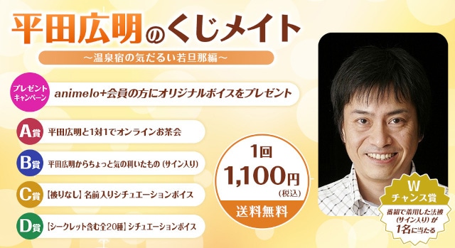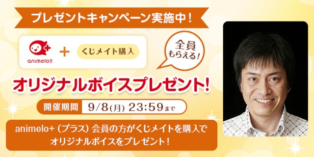 くじメイトご注文時に【キャンペーン欄へニコニコID】をご記入いただきましたanimelo+会員様へ、平田広明さんからのオリジナルボイスを1種プレゼントいたします。