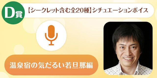 ※音声データを含むすべての景品は、ご当選された方ご本人のみが個人使用目的でご参加、ご視聴、ご使用可能なものであり、A賞、B賞、C賞、D賞すべての景品ならびに、本くじに関わるすべての権利を転用・転売・譲渡、またSNSを含むWEB等すべての媒体でのご使用等を固く禁止いたします。