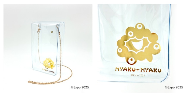 キャラクターが「ミャクミャク」の細胞を被っているように見える「缶バッジカバー」や、ぬいぐるみを入れて持ち運ぶことができる「クリアぬいバッグ」、「ぬいポーチ」などをラインナップしています。
