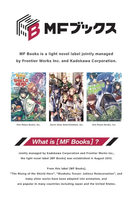 MFブックスは2013年8月に創刊された株式会社フロンティアワークスと株式会社KADOKAWAが協同で手掛けるライト文芸レーベルとなります。