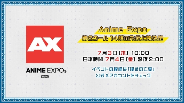 2025年7月3日(木)10:00(日本時間:2025年7月4日(金)深夜2:00)より、Anime Expoにて『嘆きの亡霊は引退したい』第14話の先行上映会を実施します。