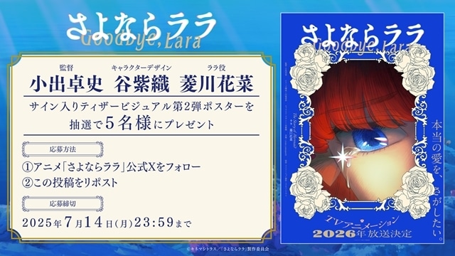 ティザービジュアル第2弾の解禁を記念して、フォロー&リポストキャンペーンを実施! アニメ公式X(@Goodbye_Lara)をフォローし、該当の投稿をリポストした方から抽選で5名に監督の小出卓史、キャラクターデザインの谷紫織、、ララ役・菱川花菜さんのサイン入りティザービジュアル第2弾ポスターをプレゼントします。