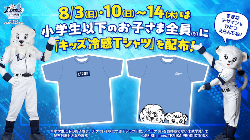 『ライオンズフェスティバルズ2025 supported by ウォータースタンド』開催期間中の、8月3日(日)・10日(日)~14日(木)に小学生以下のお子さま全員(※)に配布します!