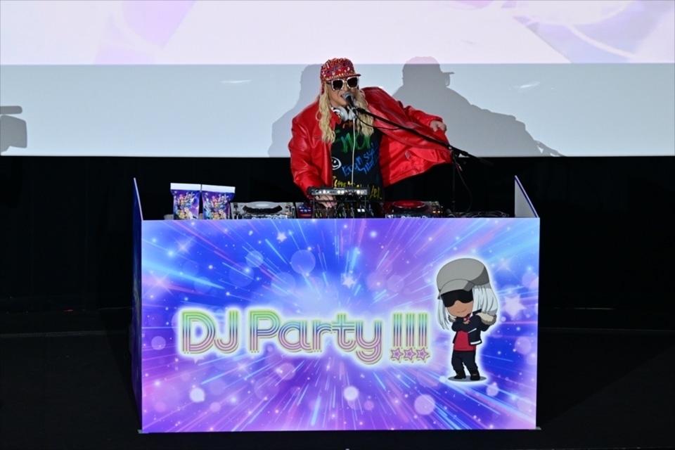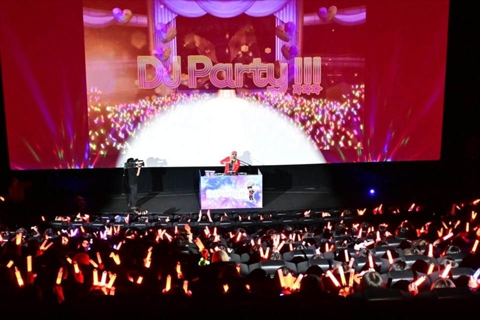 満員御礼で迎えたこの日の上映後。色とりどりのペンライトを手にした観客の興奮冷めやらぬ中、ステージには“DJ Party!!!”との文字がデザインされた特設DJブースが設置され、スタッフが機材を持ち込むたびに観客からの「準備ありがと~!」という感謝の声掛けが響いたり、スポットライトが点灯されると歓声が上がるなど、会場のアイドリングは十分すぎるほど準備万端状態に。