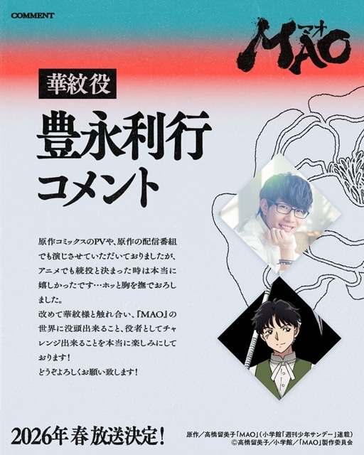 高橋留美子先生の『MAO』TVアニメ化、2026年春NHK総合にて放送決定! ティザーPV公開、出演声優に梶裕貴さん・川井田夏海さん・下野紘さん・豊永利行さん