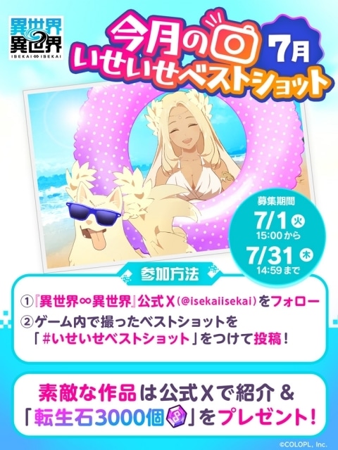 『異世界∞異世界』の公式Xをフォローして、ゲーム内で撮ったベストショットを #いせいせベストショットをつけて投稿しましょう!ベストショットに選ばれた方には転生石3,000個をプレゼントいたします。