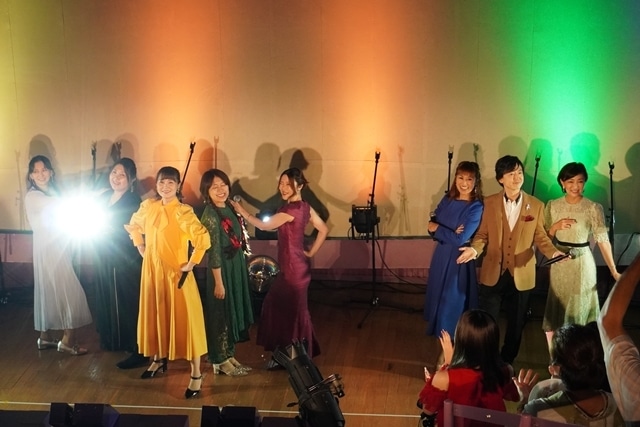▲夜公演もラストの10曲目は『サクラ大戦V』主題歌「地上の戦士」 ▲アンコールの11曲目は『サクラ大戦V』挿入歌「ここはパラダイス〜リトルリップシアターのテーマ〜」。本来は内田直哉さんが演じるマイケル・サニーサイドとワンペアによるナンバーですが、今回はサニーの代わりを新次郎が務め、内田直哉さんの歌い方やアピールの仕方を菅沼さんがリスペクト! この場にいなくても影響力が強いサニーの凄さをまざまざと感じました全員が並んで最後のトーク。ここで今回のイベントが園崎さん発案の企画であることや、選曲もすべて園崎さんが行っていたことが明かされました。小林さんもまるで「昴さんが構成」しているように感じたと語り、”紐育星組のキャラクターである九条昴がプロデュースしたショウ”という新たな2.5次元イベントの形も生まれた気がします。