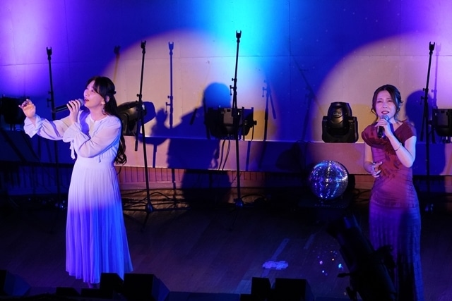 ▲スターファイブのソロパートが終わると、7曲目に松谷さんと園崎さんが「サクラ大戦 紐育星組ショウ2014 〜お楽しみはこれからだ〜」より「月光組曲」をデュエット。プラネタリウムという会場と幻想的な曲調がよく合います ▲夜公演のみ出演するプラム・スパニエル役の麻生かほ里さんと吉野杏里役の本名陽子さんが登場! 8曲目の『サクラ大戦V』挿入歌「ザ・シティー」で盛り上がります。途中から菅沼さんも加わり、客席の歓声や手拍子も一際大きく!歌唱後は菅沼さん、麻生さん、本名さんでトーク。この3人が揃うのも11年ぶりで、せっかくなので「あからさまに言っちゃあ、ヤボ~」と言いながら3人揃ってバックステップするお約束もきっちり再現。紐育星組のショウの醍醐味をこれでもかと入れてきます。