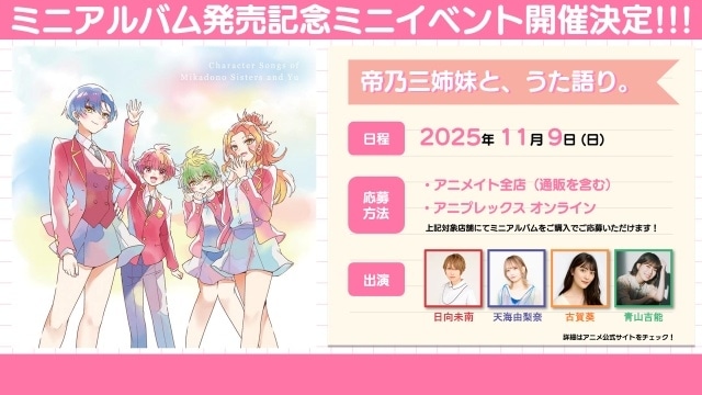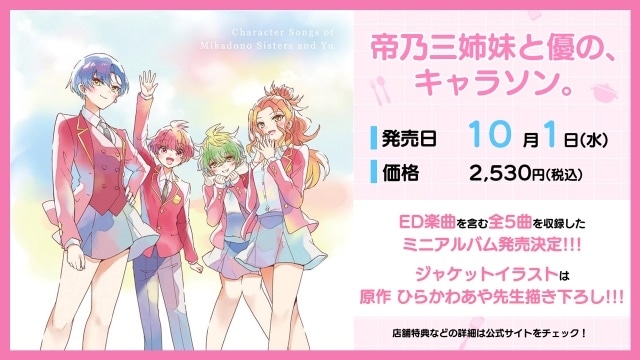 さらに、ED楽曲を収録したミニアルバム「帝乃三姉妹と優の、キャラソン。」が10月1日(水)に発売決定。11月9日(日)にリリースを記念したイベントの開催も決定しました。