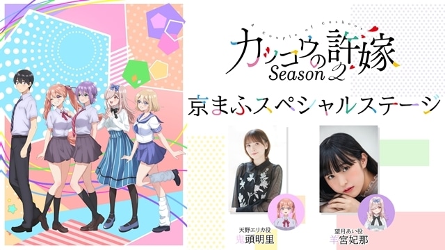 【内容】TVアニメ『カッコウの許嫁Season2』が京まふへ登場! 9月23日(火)に迫る最終・12羽目の放送直前を記念して、天野エリカ役・鬼頭明里、望月あい役・羊宮妃那によるスペシャルステージをお届けします。